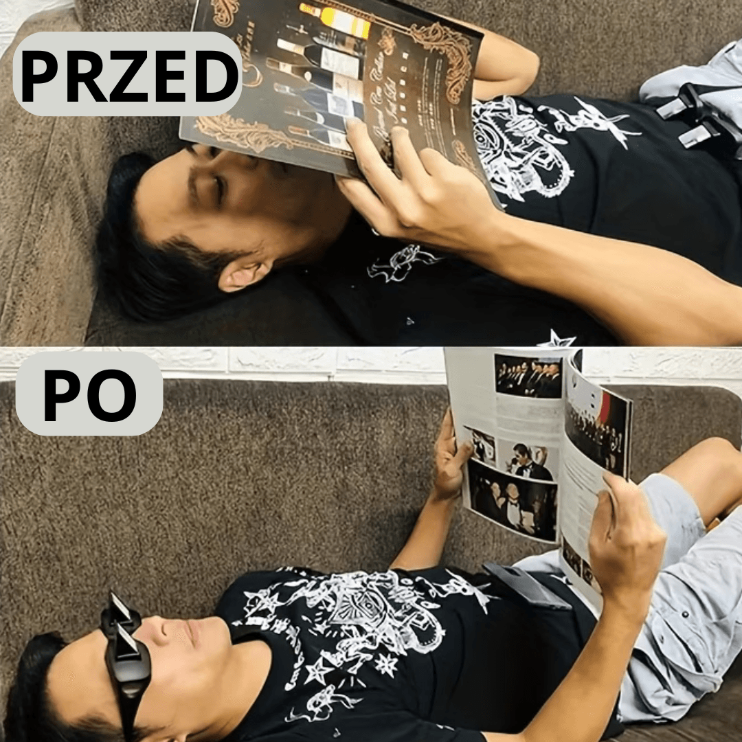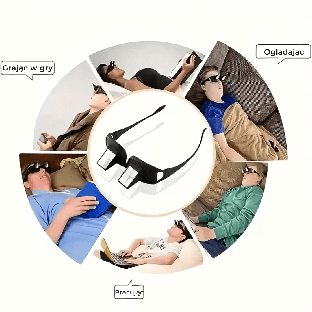 Dzięki tym okularom możesz położyć się płasko i oglądać ekran bez unoszenia głowy.